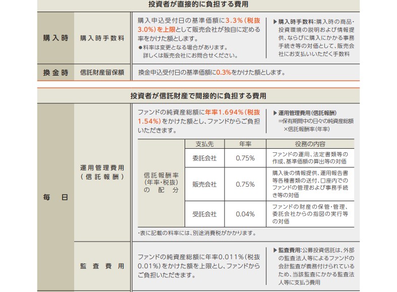 また、購入時には最大3.3%の手数料、換金時には0.3%の信託財産留保額が必要です。