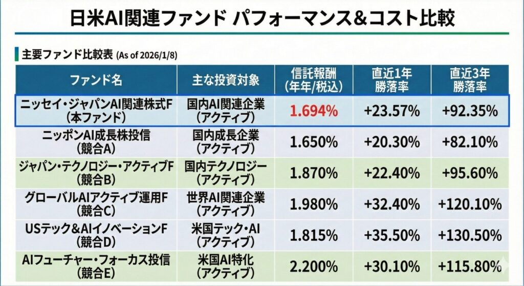 そうですね。他社のアクティブファンドと比較しても、国内のAI革命というテーマに絞って超過収益を狙いに行く、非常に戦略的な一本と言えます。コストを上回る成長性があるかを見極め、自分のポートフォリオにどう組み込むかが鍵となります。