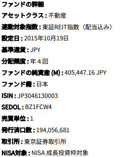 インデックスなので指数連動となり、対象インデックスは東証REIT指数(配当込み)の値動きに連動となります。