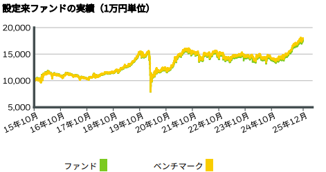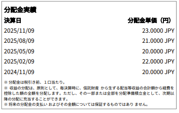 基準日2025年12月31日のデータになりますので参考にしてください。直近1年で+27.59%、3年で+20.13%の騰落率になります。資料上、1年は累積リターン、3年は年率リターンの表記になっている為、わかりやすくする為に、3年の年率リターンを1年と同様累積リターンに計算し直しています。年4回分配金も出ています。