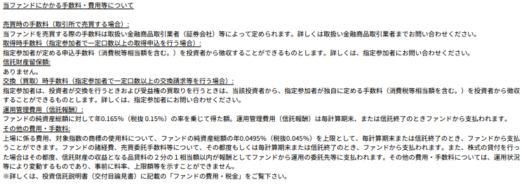 毎年の管理費用は年0.165%程度、その他手数料もかかります。