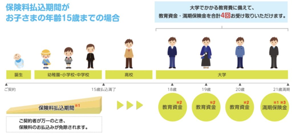 - 契約者(親)が死亡や高度障害になったときは、保険料の支払いが免除されますが、教育資金と満期金は受け取れます。