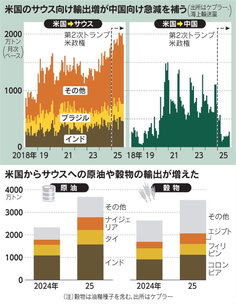 米国から中国向けの輸出量が明確に減少する一方で、インド、ブラジルを中心とするグローバル・サウス向け輸出が増加している。