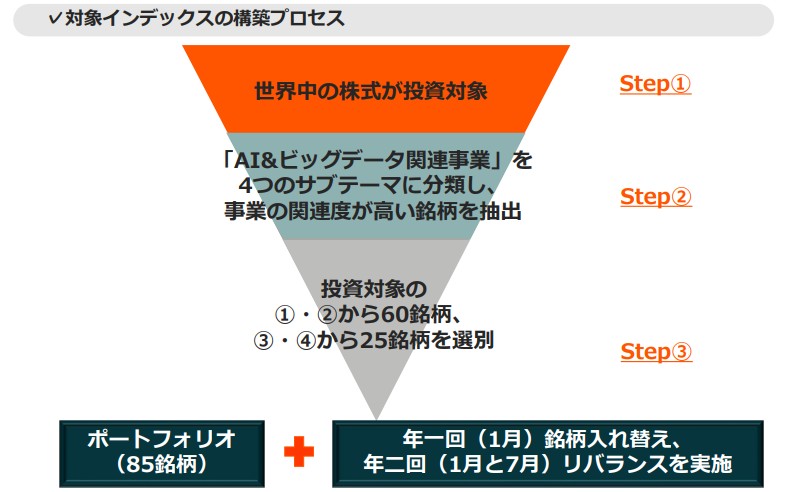製品やサービス提供においてAI技術の開発・利用拡大から利益を得る可能性がある企業や、AI・ビッグデータ分析用のハードウェアを提供する企業が対象です。事業の関連度が高い銘柄を抽出してポートフォリオを構築しています。