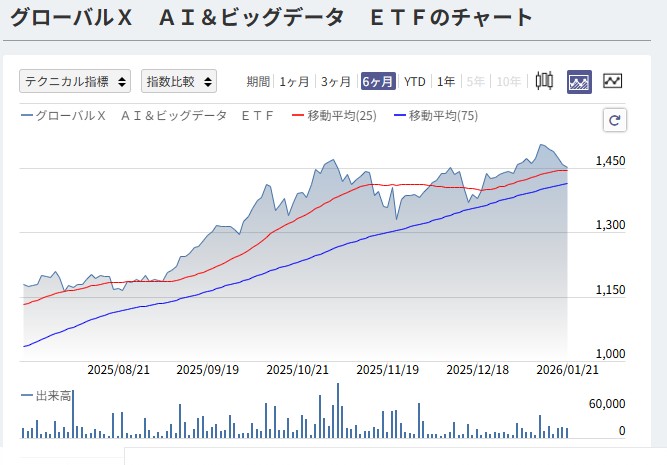 インデックス(指数)の動きにも概ね連動しており、AI・ビッグデータ分野の爆発的な成長を捉えていることが数値からも分かります。