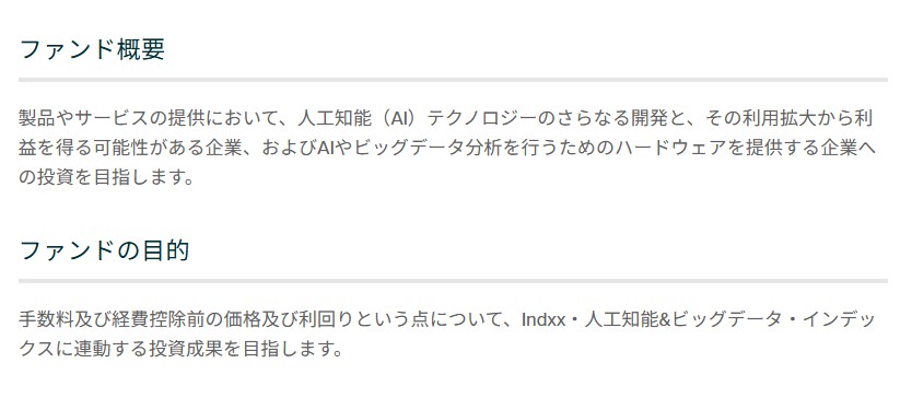 この銘柄はインデックス型のETFなので指数連動となり、対象インデックスである「Indxx Artificial Intelligence & Big Data Index(円換算)」の値動きに連動する運用成果を目指すものとなります。