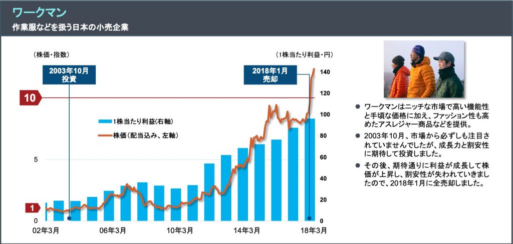 実際、現場作業や工場作業向けの作業服や関連用品の専門店として、今では日本最大手までに成長した「ワークマン」は、まだ市場から注目されていなかった2003年10月の段階で投資しておりますが、その後、株価は10倍以上になってます。