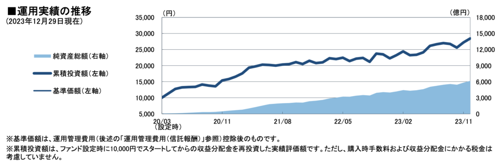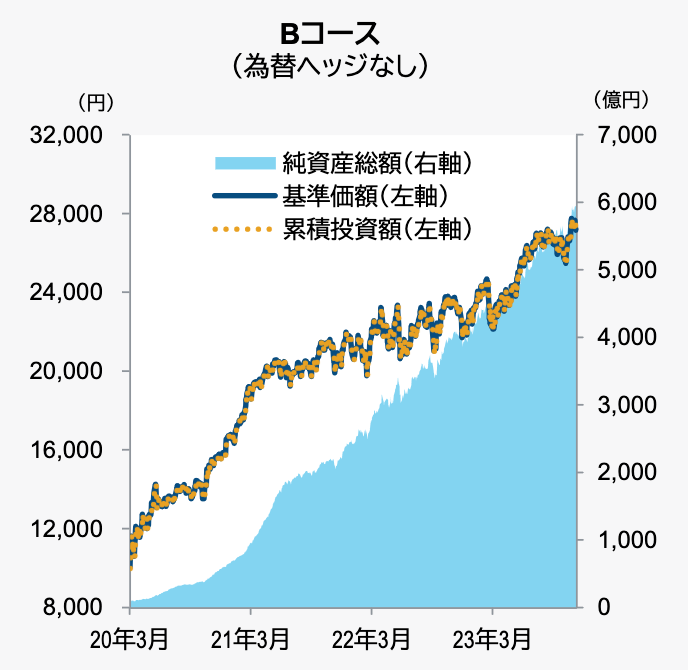 Bコース(為替ヘッジなし)で言えば、2020年3月23日の設定来184.40%と、4年弱で3倍近くまでになっております。