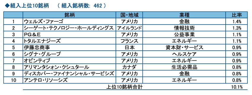 最新の月次運用レポート(2023年12月29日現在)によると、組入銘柄数は462となっており、そのうち上位10銘柄は以下のようになっております。