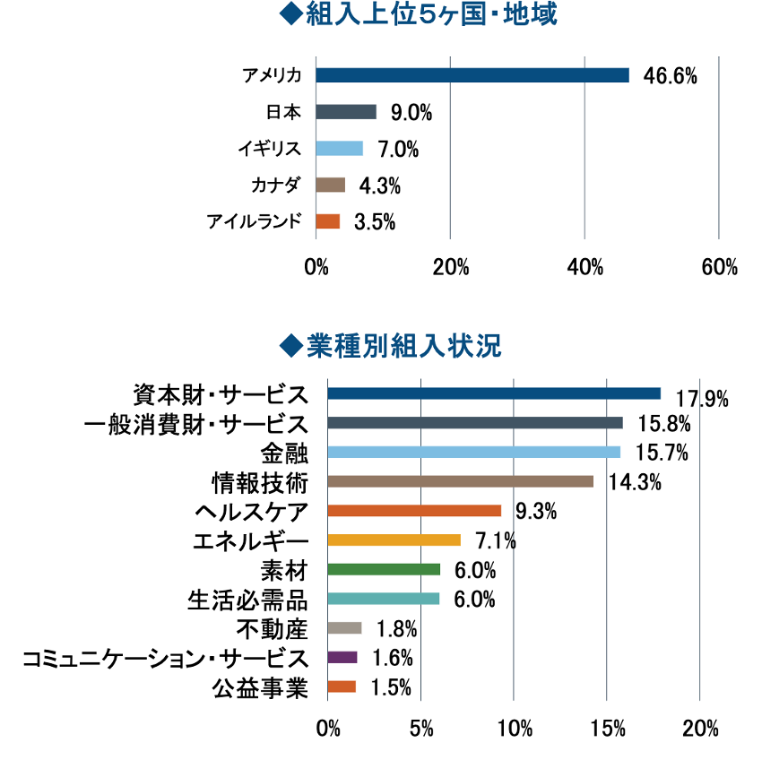 以下は、組入上位5ケ国と業種別組入状況となります。