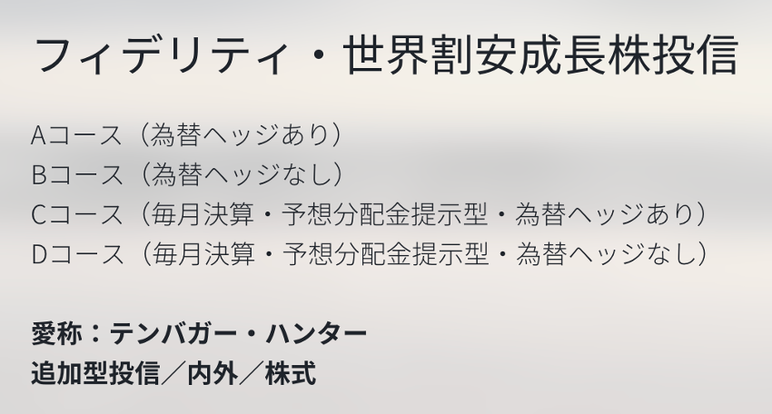 今回は、「フィデリティ・世界割安成長株投信 愛称:テンバガー・ハンター」について解説します。