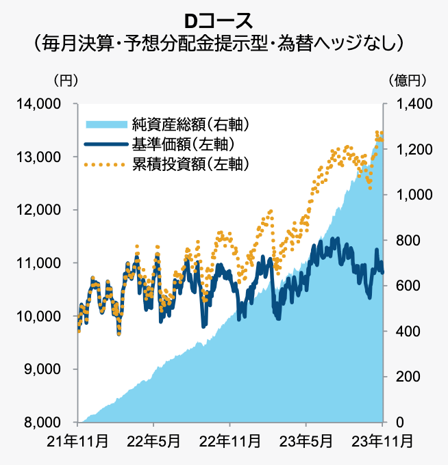 Bコースは「基準価額」と「累積投資額」が一致しているのに対し、Dコースは乖離があるのが確認できるかと思います。