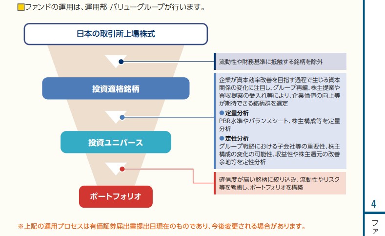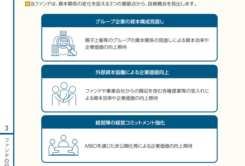 TOPIXなどの指数への連動を目的とせず、個別企業の資本政策や経営改革の進展を重視するボトムアップ型の運用が特徴です。