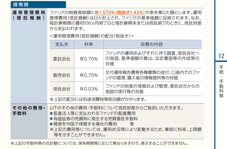 保有期間中にかかる運用管理費用(信託報酬)は、ファンドの純資産総額に対して年率1.573%(税抜1.43%)です。