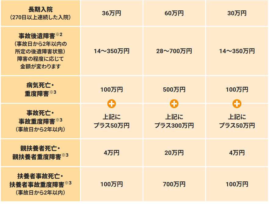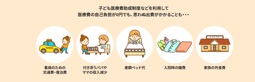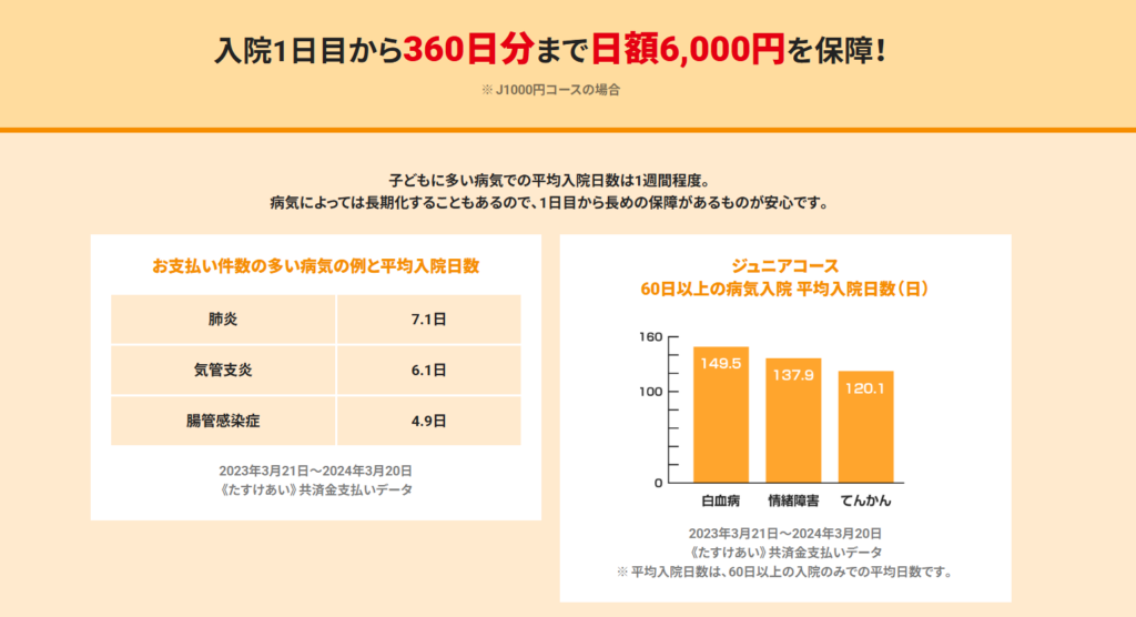 例えば、たすけあいジュニアコースJ1000だと短期入院で3日間入院した場合、6,000円×3日=18,000円です。これで実際の出費(付き添い・交通費・休業による収入減少など)をまかなえるでしょうか。ここを具体的にイメージする必要があります。