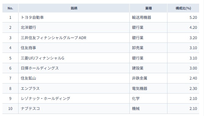 銀行、商社、建設、非鉄金属、電気機器、化学、機械といったように、特定の業種に偏らない分散構成となっています。