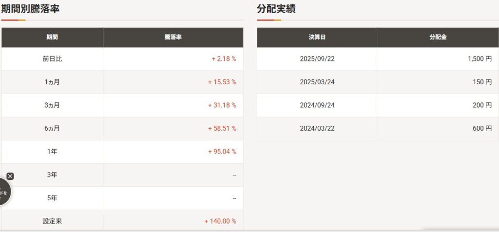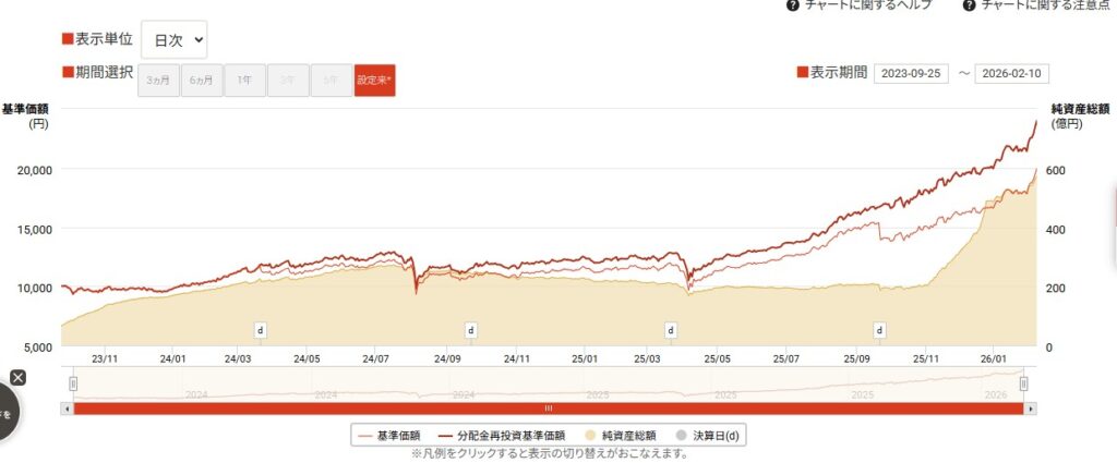 基準日2026年2月10日時点のデータを参考にすると、本ファンドの騰落率は直近1年で+95.04%、設定来で+140.00%となっています。