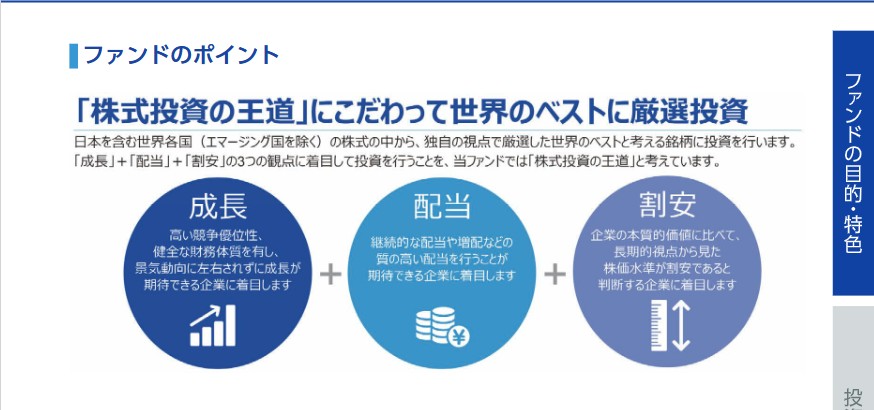 バイオのような特定テーマ型ファンド(2.09%)に比べれば、本ファンドのコストはやや抑えられています。重要なのは、本ファンドが「成長・配当・割安」という3つの多角的な視点から、日本を含む世界中の「王道」銘柄をプロが厳選している点です。