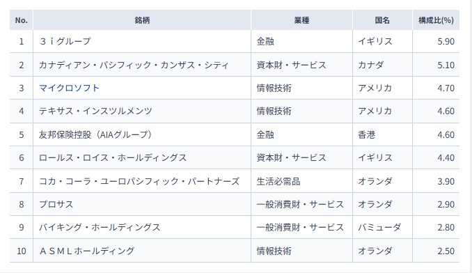 上位の顔ぶれを見ると、一般的な世界株インデックスとはかなり印象が違いますね。マイクロソフト(4.70%)のようなテック企業もありますが、トップはイギリスの金融、3iグループ(5.90%)なんですね。
