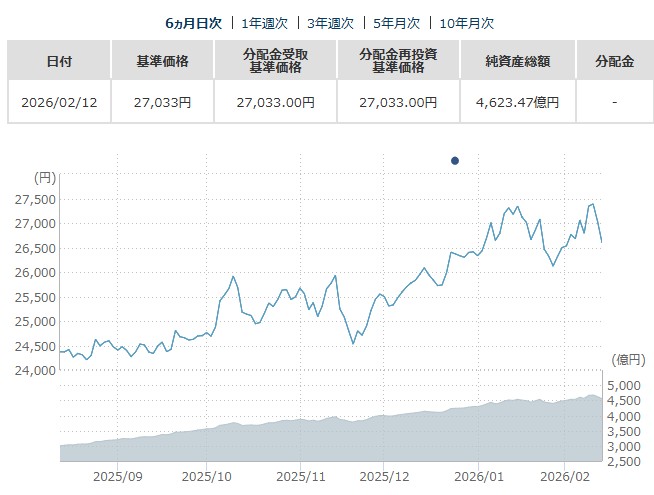 2026年2月時点で基準価額27,033円、純資産約4,623億円と堅調な成長を見せており、直近3年の年率リターンは+23.68%、シャープレシオ1.87という極めて高い運用効率を誇ります。