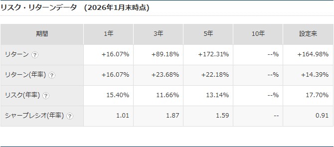 - 直近3年で年率+23.68%、シャープレシオ1.87と極めて高い運用効率を誇り、基準価額27,033円(2026年2月時点)と着実に成長