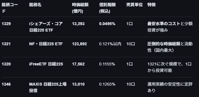 同種の他ETFと比較をするとこのようになっています。日経平均株価(日経225)に連動するETFになっていますが、細かく見るとiシェアーズ・コア日経225ETFのように若干違う指数に連動している場合がある為、注意が必要です。