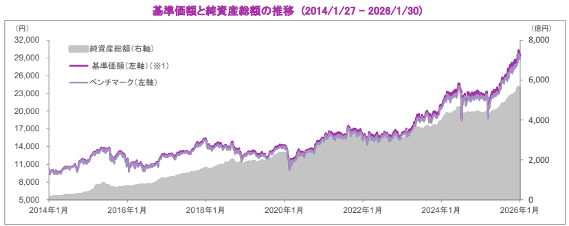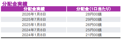 基準日2026年1月30日のデータになりますので参考にしてください。直近1年で+27.43% 、設定来で+194.84%の騰落率になります。年2回の分配金も出ています。