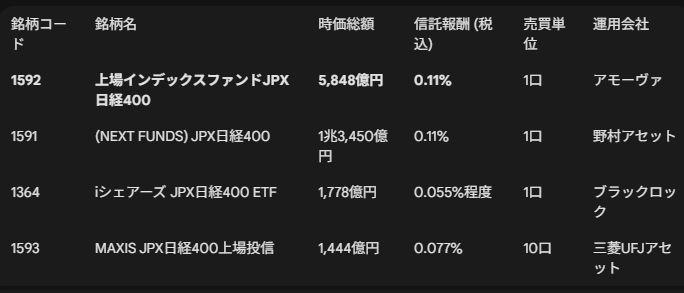 同種の他ETFと比較をするとこのようになっています。すべてJPX日経400指数に連動するETFになっていますが、純資産総額と流動性は相関する為、純資産総額と手数料を考えて選択すると良いかと思います。