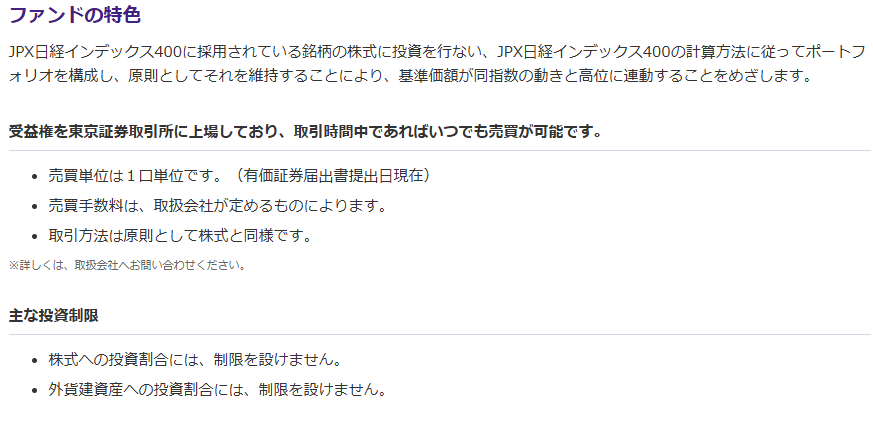 インデックスなので指数連動となり、対象インデックスはJPX日経400の値動きに連動となります。