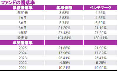 直近1年で+27.43% 、設定来で+194.84%