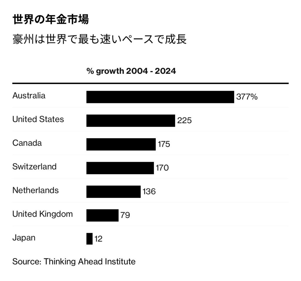 年金市場とは、老後資金として積み立て・運用される総資産であり、国家の資本形成力を映す指標である。2004年から2024年にかけて、豪州が377%と急成長し、日本が12%にとどまった差は、制度設計、人口構造、運用姿勢、投資文化の違いによって生まれた必然的結果である。