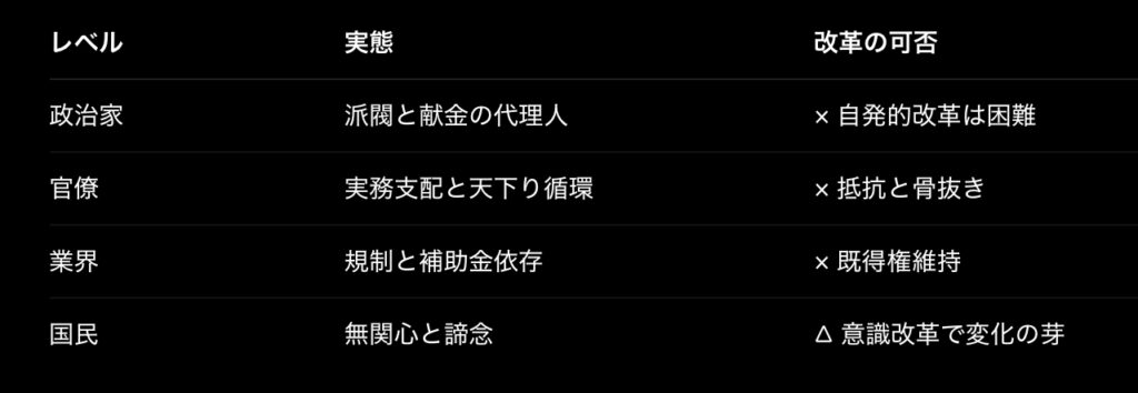 それぞれが“票と金の供給源”であり、政治家はそれを壊せば自分の生命線を失う。