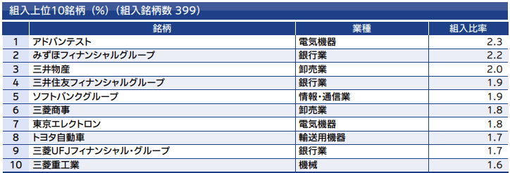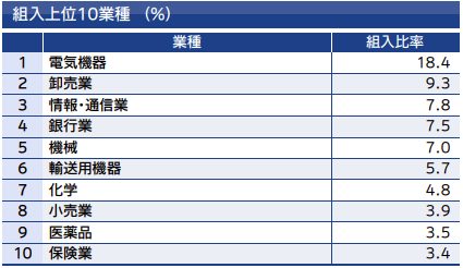 最近は日本株もAI関連がトレンドになっていますが、関連する電気機器の業種が組み入れ順位では1位になっています。2位以下の業種とは組み入れ比率が全然違いますね。