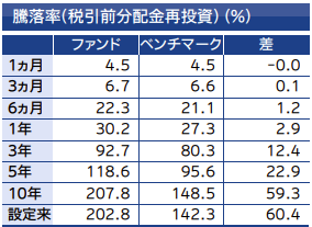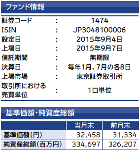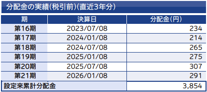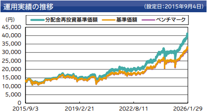 基準日2026年1月30日のデータになりますので参考にしてください。直近1年で+30.2% 、3年で+92.7%の騰落率になります。年2回の分配金も出ています。