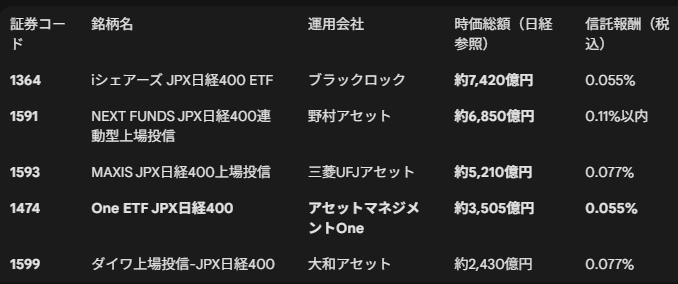 同種の他ETFと比較をするとこのようになっています。すべてJPX日経400指数に連動するETFになっていますが、純資産総額と流動性は相関する為、純資産総額と手数料を考えて選択すると良いかと思います。