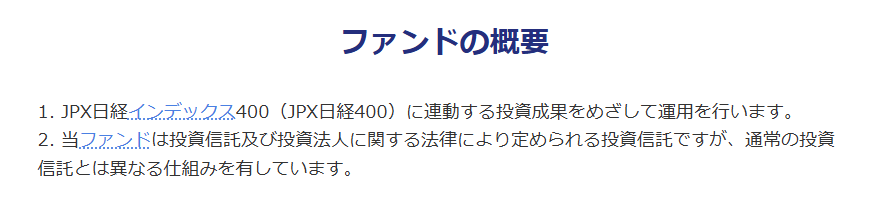 インデックスなので指数連動となり、対象インデックスはJPX日経400の値動きに連動となります。