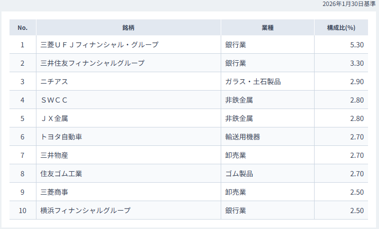 組入上位10銘柄には、メガバンクを筆頭にトヨタ自動車や三井物産など、日本経済の屋台骨を支える巨大企業が並んでいます