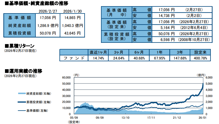 基準日2026年2月27日時点の運用実績です。基準価額は過去最高値の17,056円、直近1年間の騰落率は+67.95%と、日本株の活況をダイレクトに捉えた非常に力強い成長を見せています。