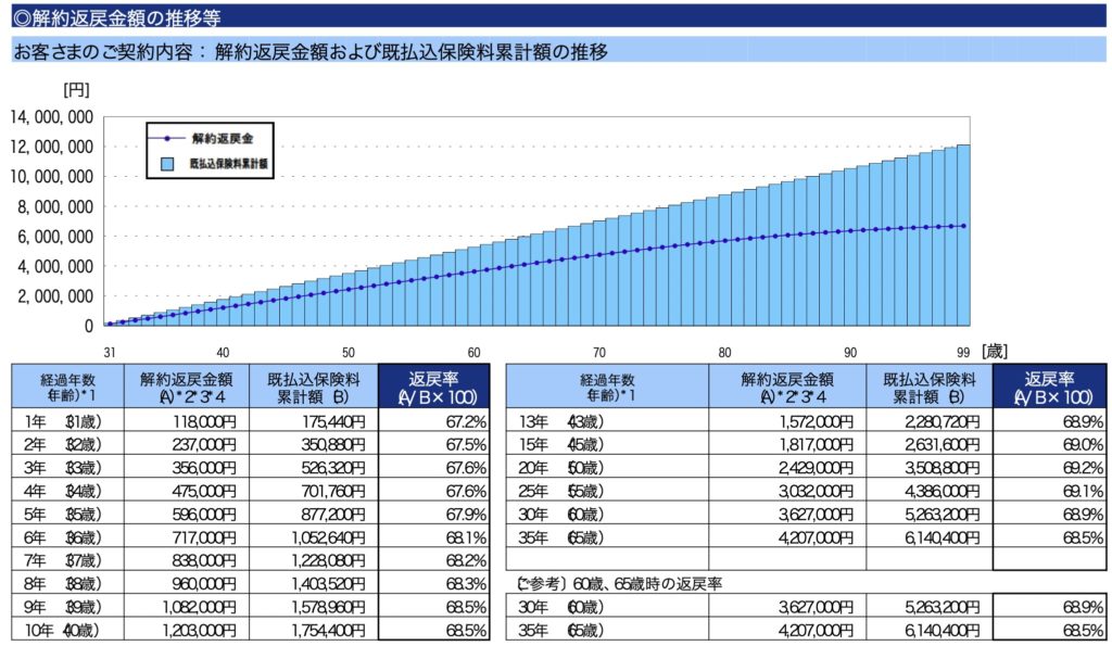 • 解約返戻率は30年で68%、実質利回りは年-2.53%