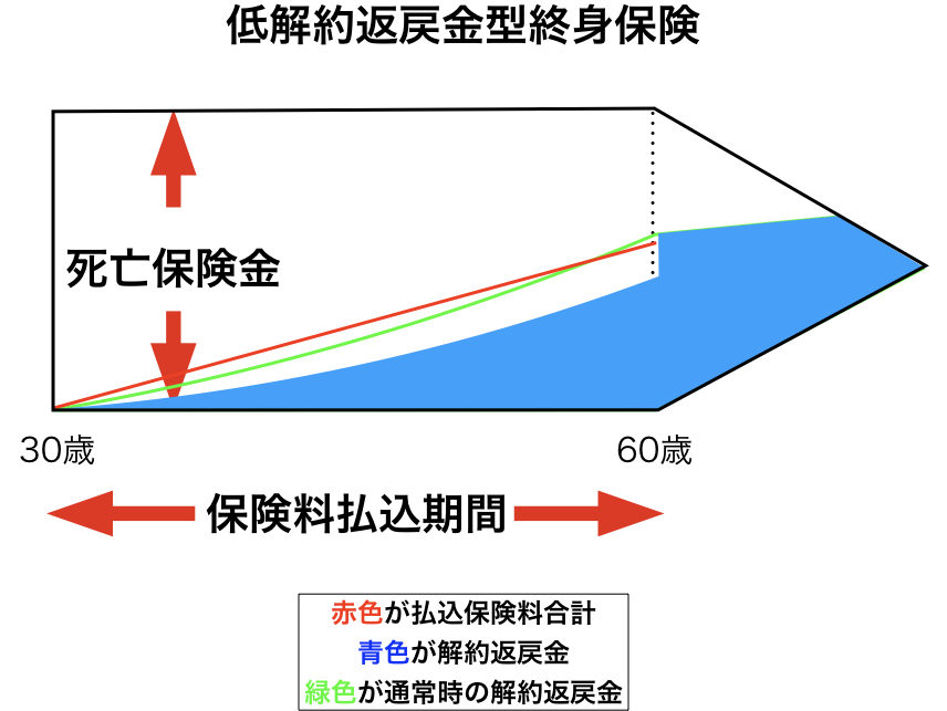 低解約返戻金型は通常の終身保険よりも保険料が安くなります。しかし、デメリットもあって保険料払込期間中は本来の解約返戻金の70%になってしまいます。保険料の払込が終了すると通常の終身保険と同じ解約返戻金になります。
