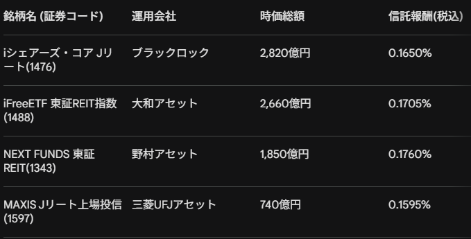 よくわかりました。まだ若いので分配金が出るREITにはあまり魅力を感じないのですが、買うならどのETFにするか、純資産総額、手数料を考えて購入したいと思います。