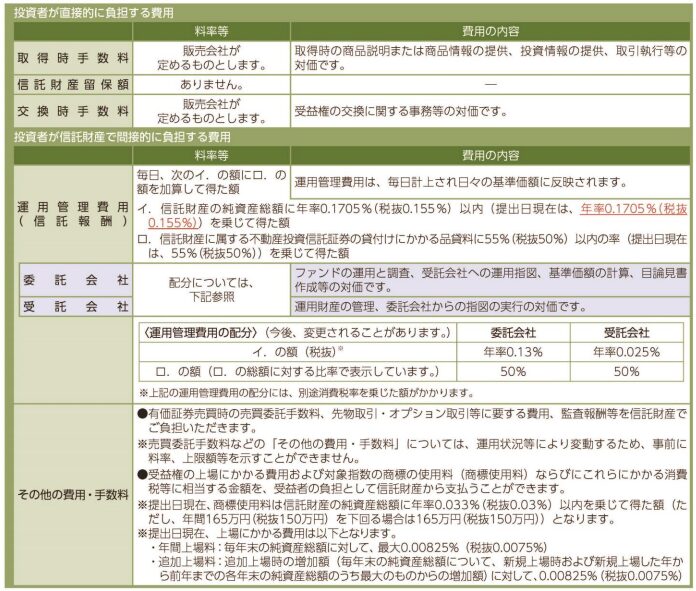 毎年の管理費用は年0.1705%程度、その他手数料もかかります。