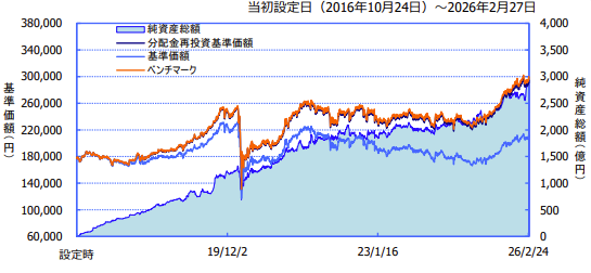 基準日2026年2月27日のデータになりますので参考にしてください。直近1年で+23.0%、3年で+27.1%の騰落率になります。年4回の分配金も出ています。