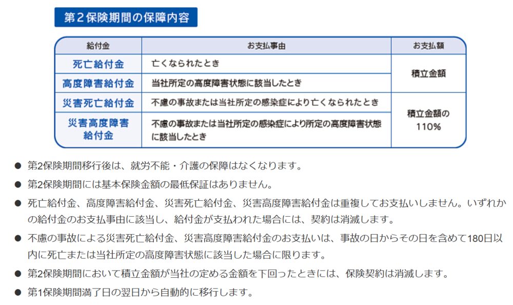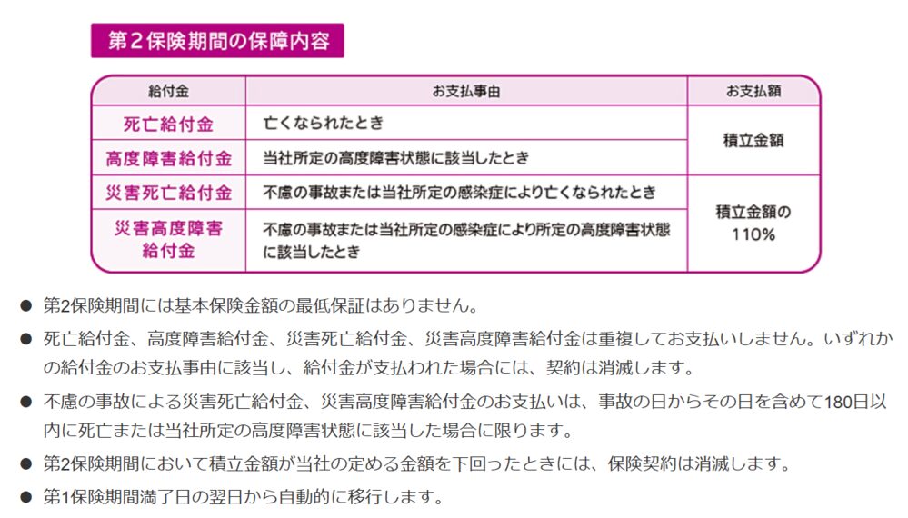 第2保険期間は最低保証がない代わりに、保険料の払い込みなしに死亡時まで保障を受けられます。万が一の場合に積立金額の110%を受け取れるとともに、積立金額を好きなタイミングで活用できる点も特徴です。このため、万が一に備えるだけでなく、必要や経済状態に応じて積立金を活用できます。
