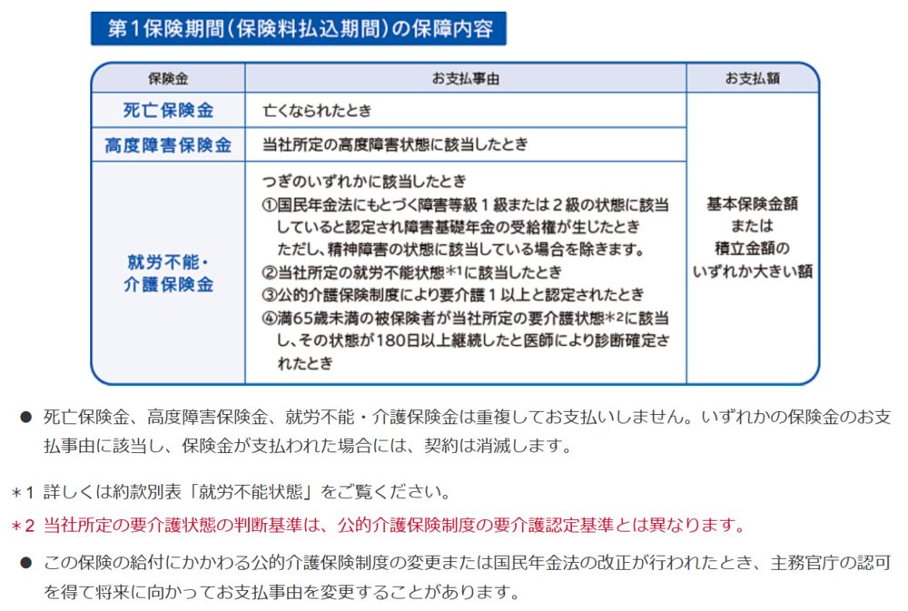 中でも就労不能・介護保険型では、第1保険期間であれば死亡や高度機能障害の場合だけでなく、就業不能状態や要介護状態になった時でも保険金・積立金を受け取れる仕組みです。このため、万が一の場合に加えて病気などで働けなくなるケースにも備えられます。