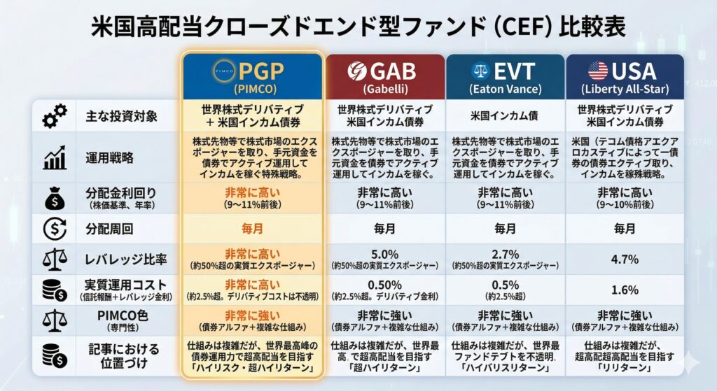 比較してみると、PGPは単に利回りが高いCEFというより、収益源の数と運用戦略の深さで差をつけている印象がありますね。