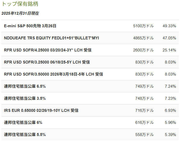 上位を見ると個別株ではなく、S&P500先物やTRS、金利スワップなどが占めており、現物株よりもエクスポージャー設計そのものに特徴があります。
