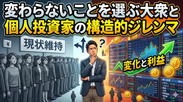 これは単なる怠慢ではない。心理的な防衛本能、情報環境、社会的同調圧力が複合的に作用した結果として、極めて自然に生まれる構造である。そして厄介なのは、この選択が短期的には安心と整合性をもたらしながら、中長期ではほぼ確実に資産格差と機会損失へと収束する点にある。本稿では、この構造とジレンマ、そして最終的にどのような結果が市場で現れるのかを整理する。