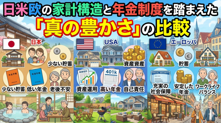 日本人は「現金を持っているが増えない」、米国人は「所得も資産も増えやすいが不安定」、欧州人は「市場での爆発力は弱いが制度で守られる」という三極構造が、現在の先進国の実態である。表面的には、円安・低所得・預金偏重の日本が最も不利に見え、株高の恩恵を受ける米国が最も豊かに見える。しかし、年金制度や医療、社会保障まで含めた「トータルの生活の質」で評価すると、単純な優劣は変わる。本質的には、「①稼ぐ力」「②資産を増やす力」「③制度による下支え」の3軸で評価すべきであり、この3つのバランスの取り方が日米欧で大きく異なる。本稿では、それぞれの構造を分解し、「誰が最も裕福なのか」を多面的に結論づける。