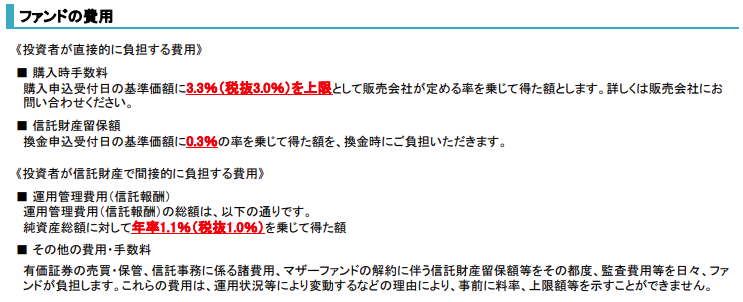 購入手数料3.3%、解約時手数料0.3%、毎年の管理費用は年1.1%程度、その他手数料もかかります。